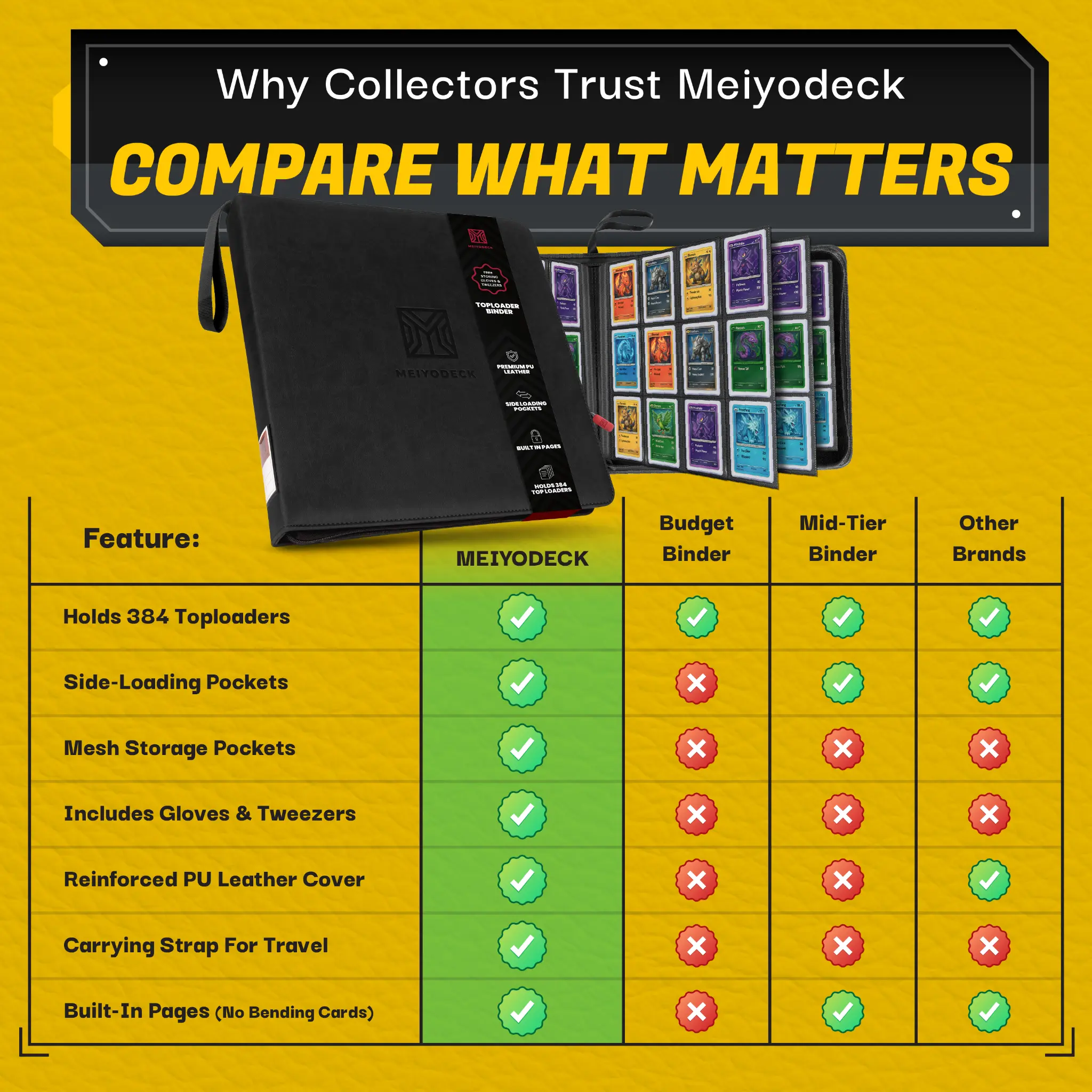 From Pokémon first editions and vintage sports cards to full MTG sets — Meiyodeck binders are trusted by collectors who take their collection seriously.